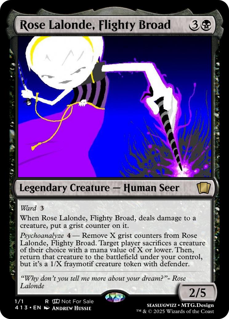 Psychoanalyze {4}- Remove X grist counters from Rose Lalonde, Flighty Broad. Target player sacrifices a creature of their choice with a mana value of X or lower. Then, return that creature to the battlefield under your control, but it's a 1/X fraymotif creature token with defender.