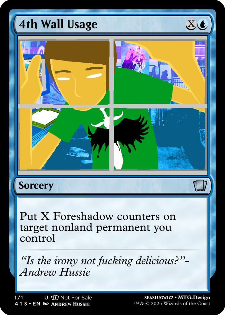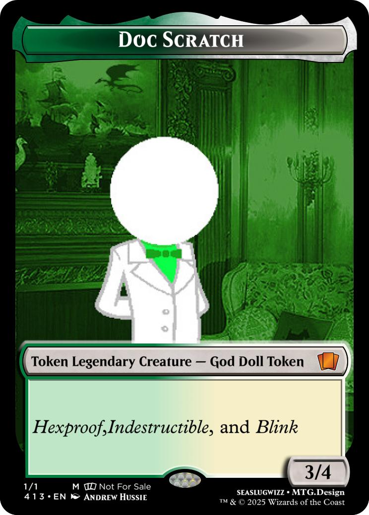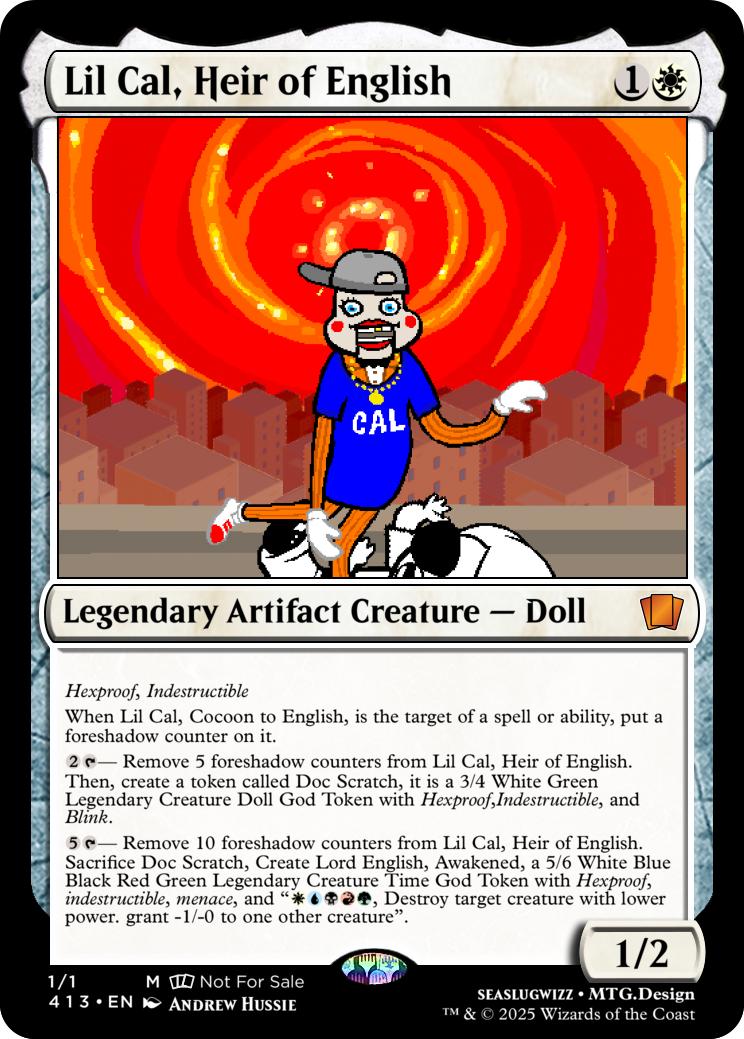 {2}{T}- Remove 5 foreshadow counters from Lil Cal, Heir of English. Then, create a token called Doc Scratch, it is a 3/4 White Green Legendary Creature Doll God Token with Hexproof,Indestructible, and Blink.