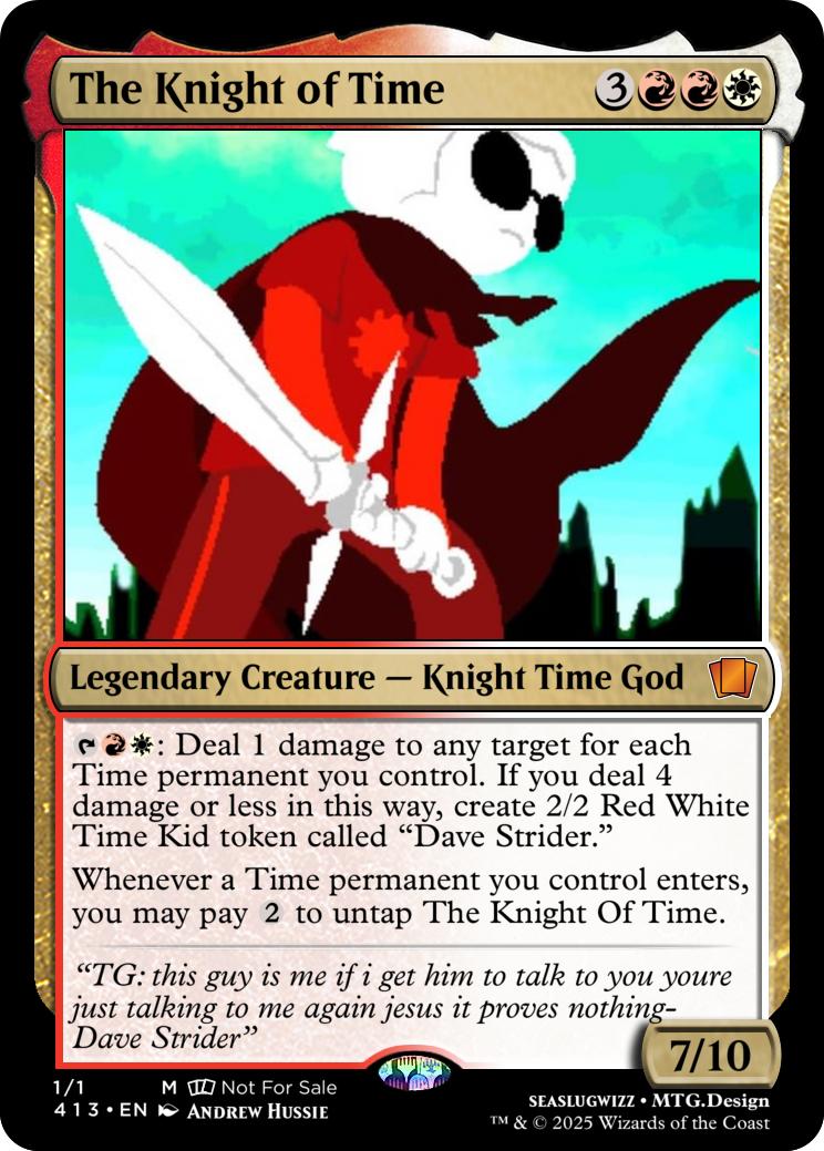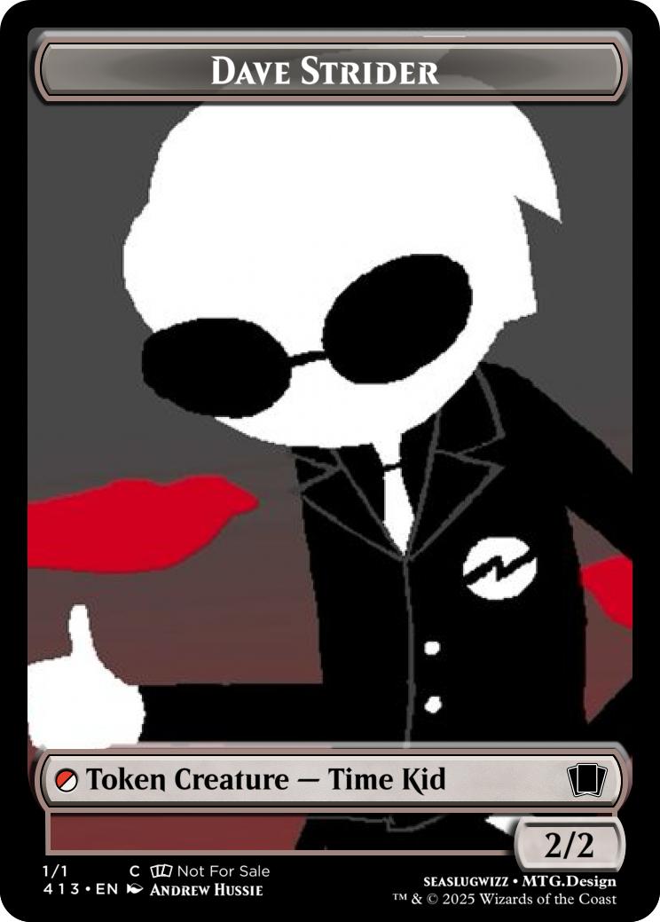 {T}{R}{W}: Deal 1 damage to any target for each Time permanent you control. If you deal 4 damage or less in this way, create 2/2 Red White Time Kid token called "Dave Strider."