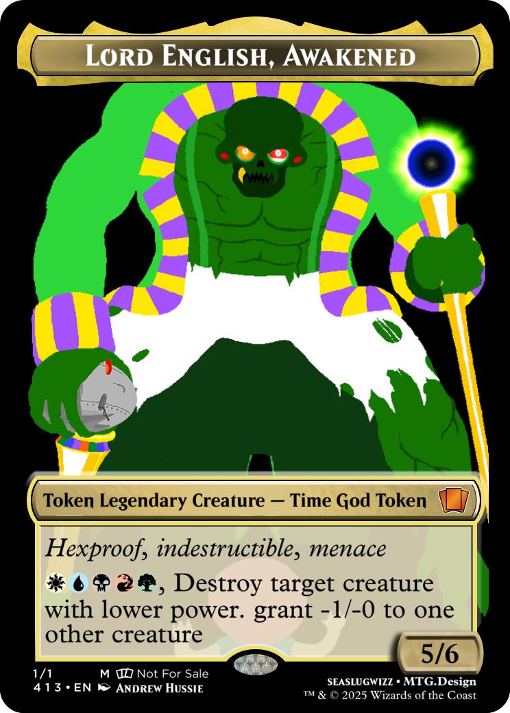 {5}{T}- Remove 10 foreshadow counters from Lil Cal, Heir of English. Sacrifice Doc Scratch, Create Lord English, Awakened, a 5/6 White Blue Black Red Green Legendary Creature Time God Token with Hexproof, indestructible, menace, and "{W}{U}{B}{R}{G}, Destroy target creature with lower power. grant -1/-0 to one other creature".
