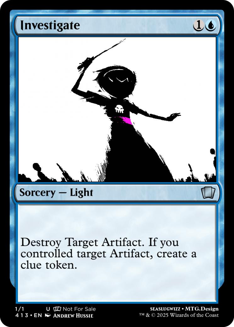 Destroy Target Artifact. If you controlled target Artifact, create a clue token.
