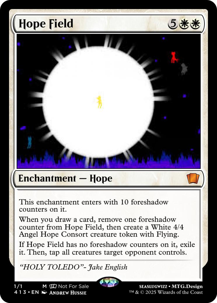 When you draw a card, remove one foreshadow counter from Hope Field, then create a White 4/4 Angel Hope Consort creature token with Flying.
