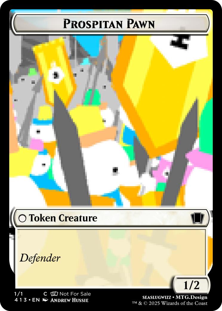 {T}{2}- Create a 1/2 White Prospitan Pawn creature token with Defender.