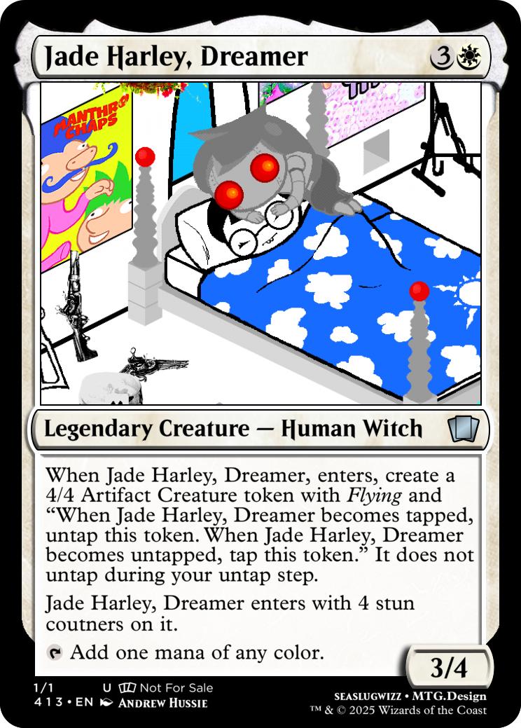 When Jade Harley, Dreamer, enters, create a 4/4 Artifact Creature token with Flying and "When Jade Harley, Dreamer becomes tapped, untap this token. When Jade Harley, Dreamer becomes untapped, tap this token." It does not untap during your untap step.