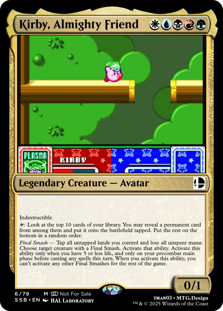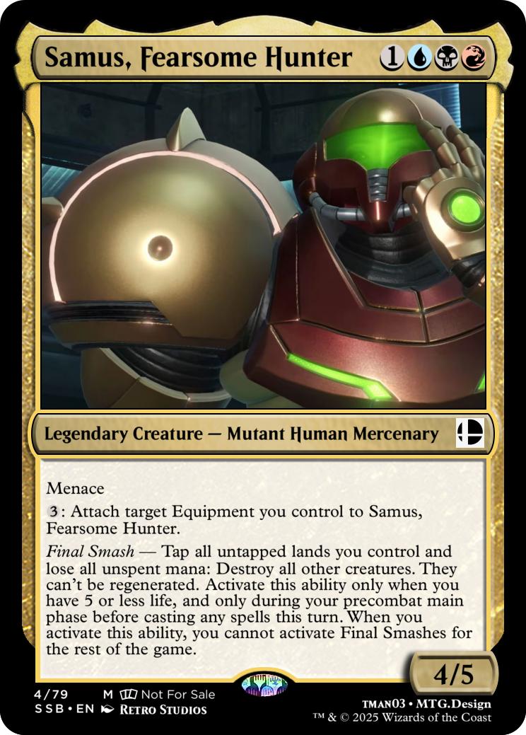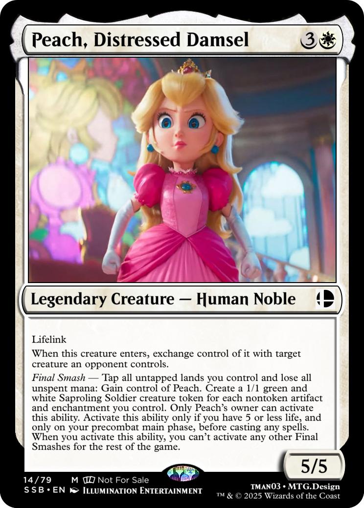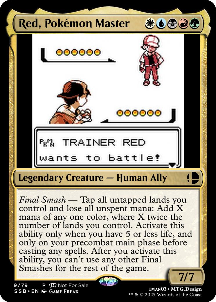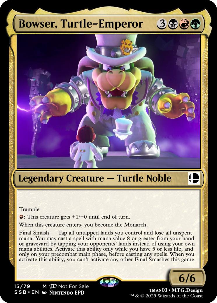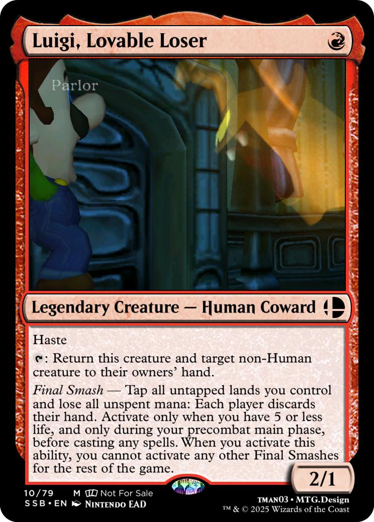 Final Smash— Tap all untapped lands you control and lose all unspent mana: Mario deals 10 damage to each opponent and you gain 10 life. Activate this ability only if you have 5 or less life, and only on your precombat main phase before casting any spells this turn. When you activate this ability, you can’t activate Final Smashes for the rest of the game.