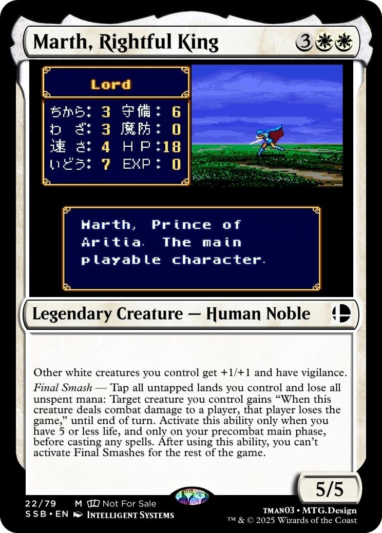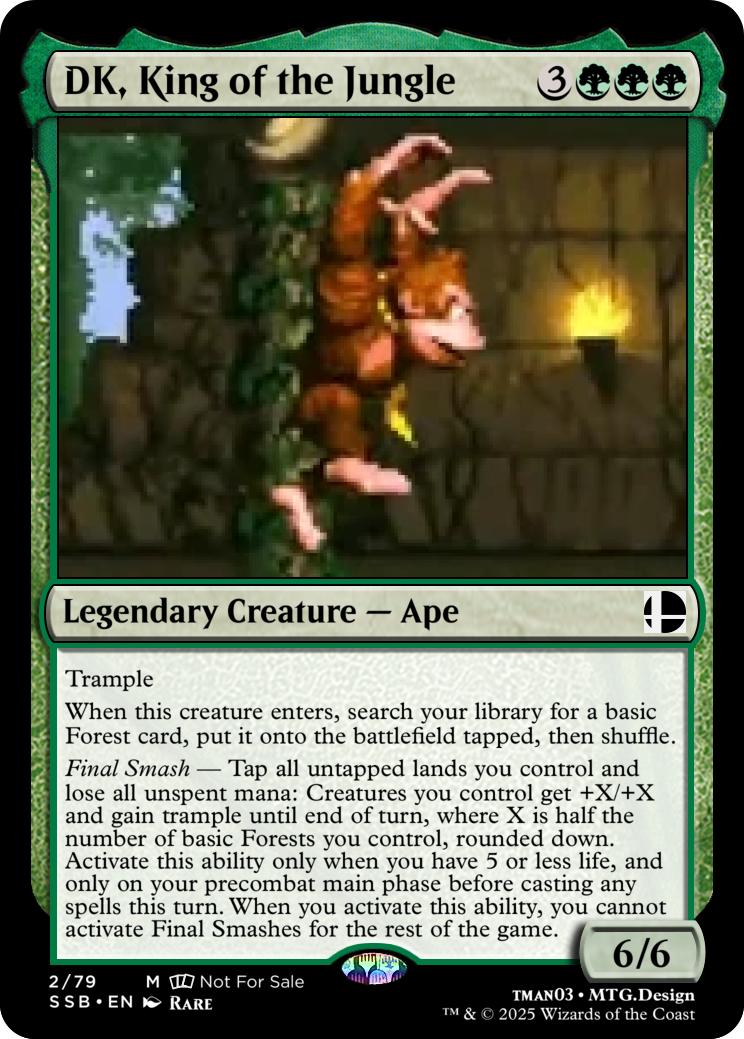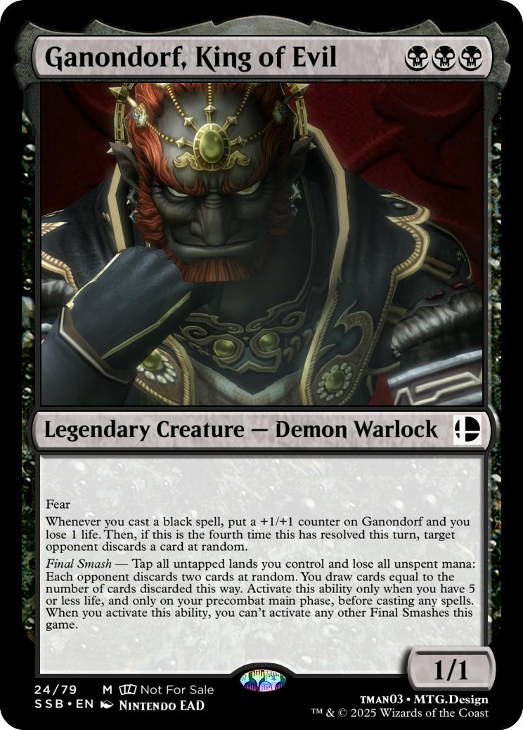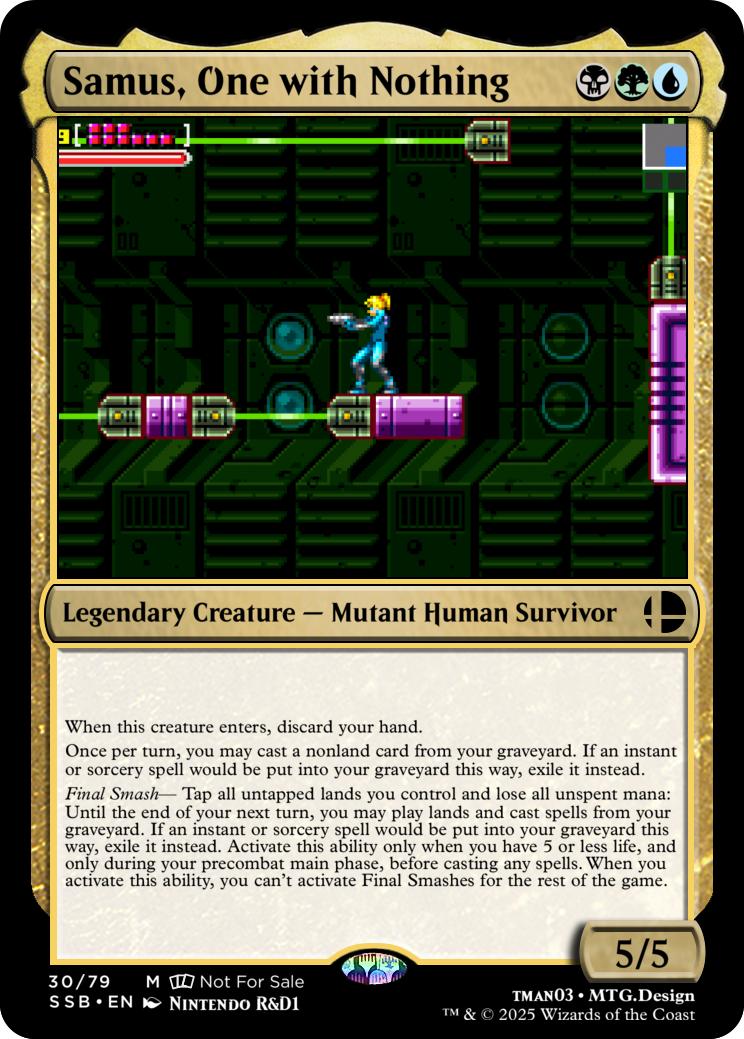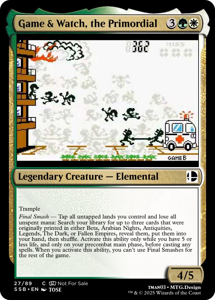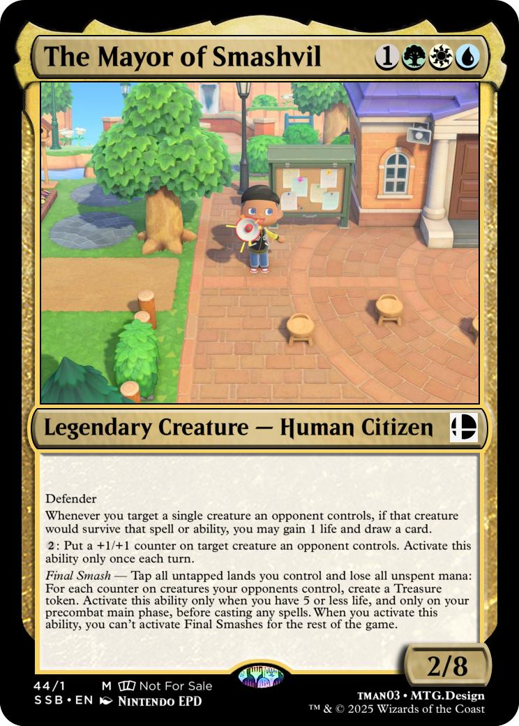 Final Smash— Tap all untapped lands you control and lose all unspent mana: Mario deals 10 damage to each opponent and you gain 10 life. Activate this ability only if you have 5 or less life, and only on your precombat main phase before casting any spells this turn. When you activate this ability, you can’t activate Final Smashes for the rest of the game.