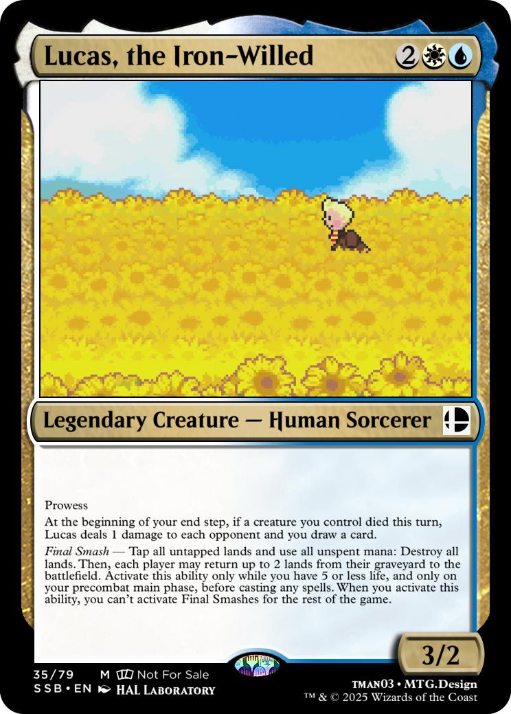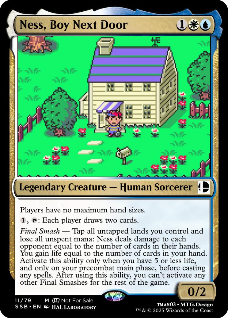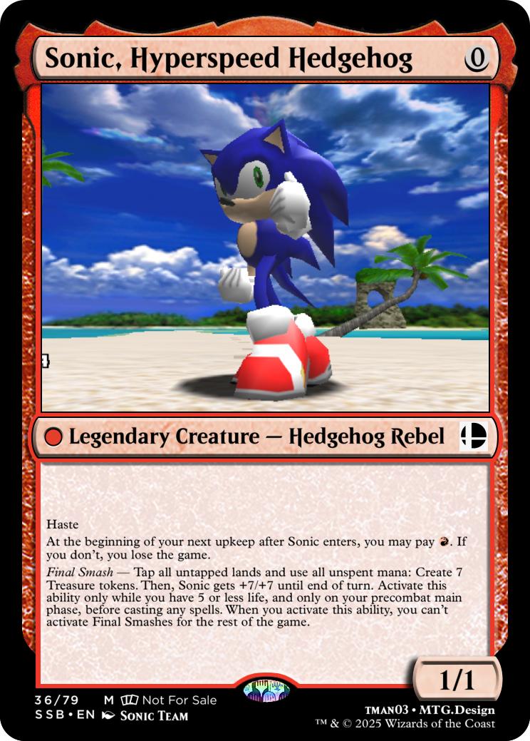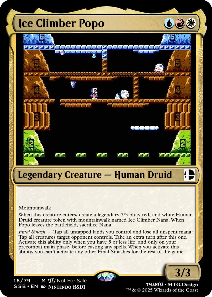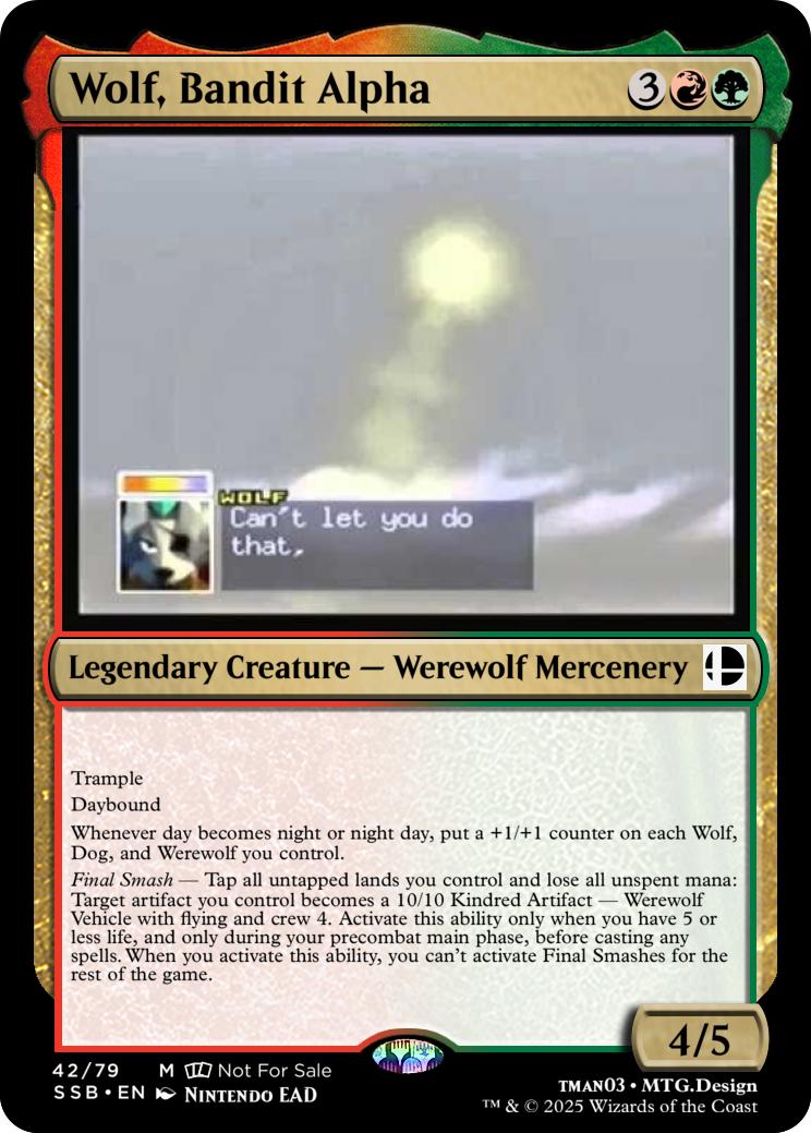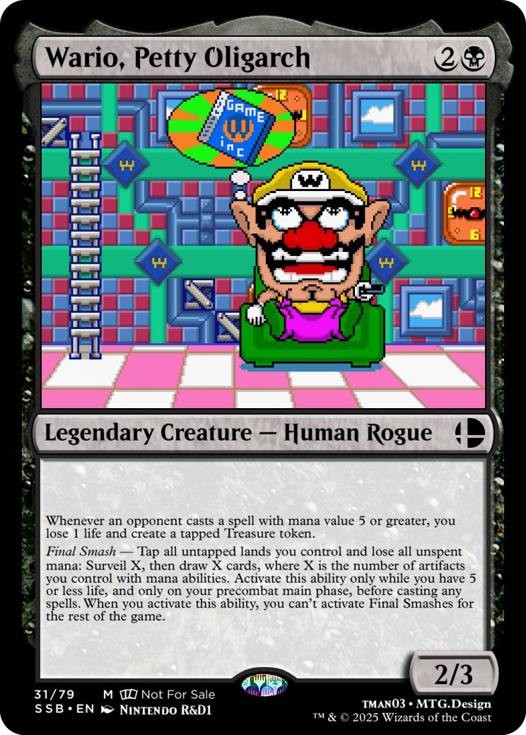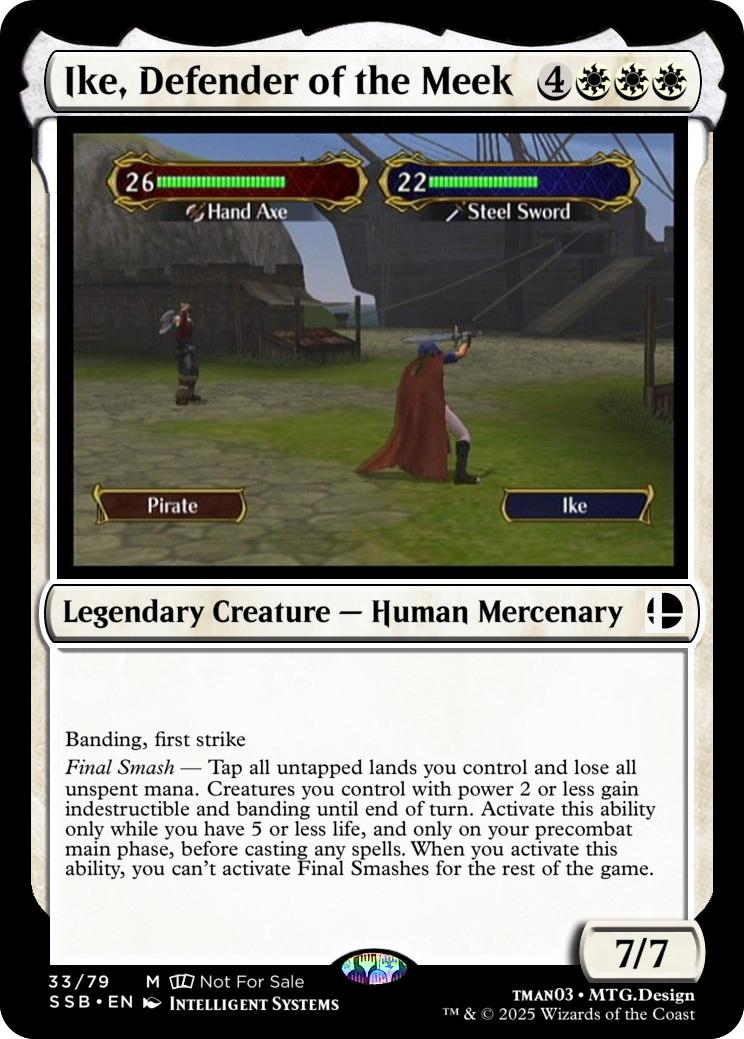Final Smash— Tap all untapped lands you control and lose all unspent mana: Mario deals 10 damage to each opponent and you gain 10 life. Activate this ability only if you have 5 or less life, and only on your precombat main phase before casting any spells this turn. When you activate this ability, you can’t activate Final Smashes for the rest of the game.